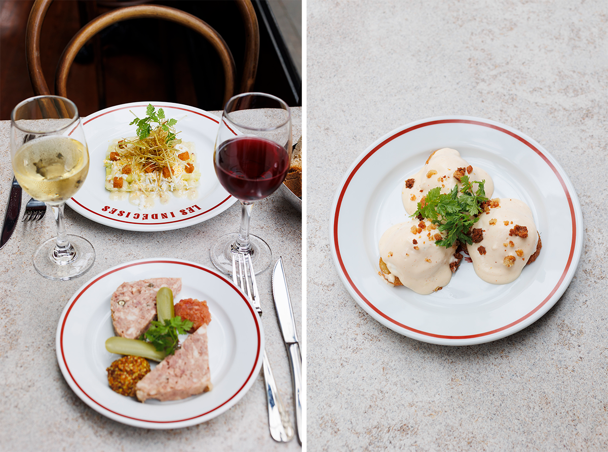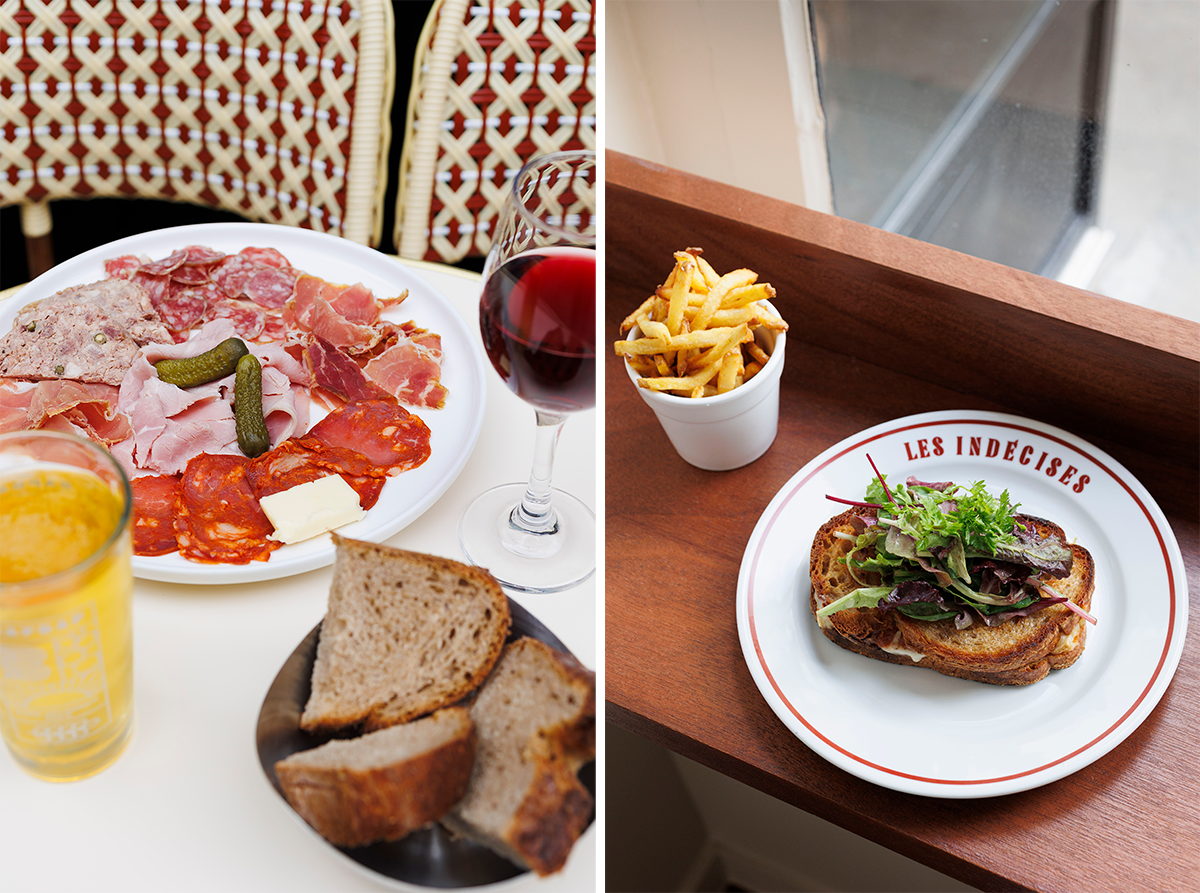 ランチとディナーの間の半端な時間でも、レザンデシーズでは食べて飲んで、という寛ぎタイムのためのメニューが充実している。クロックムッシュは1日中サービスされ、ランチとディナーの時は写真には右のようにフライドポテトとサラダがセットされる。photography: ©AliceCasenave