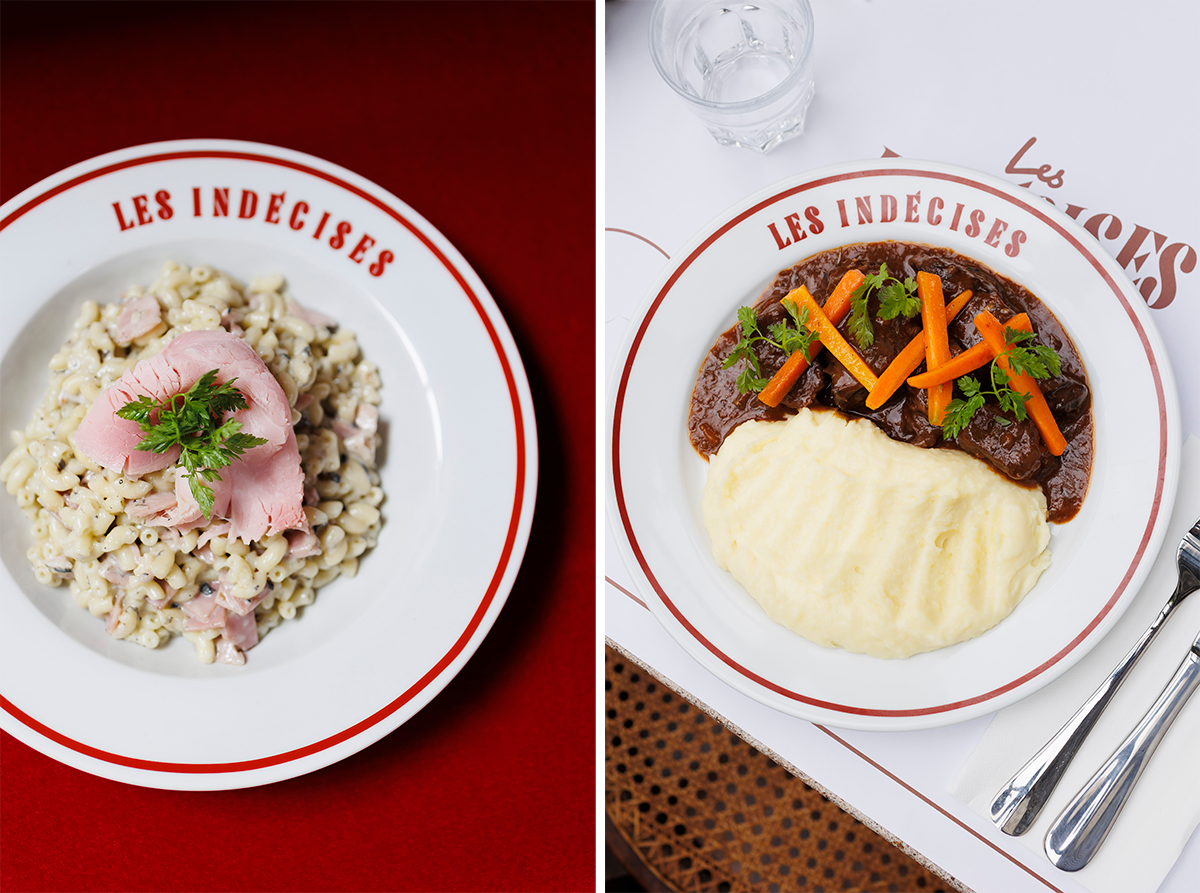 アラカルトのメインから。左はトリュフ風味パスタのコキエット。右は牛肉の”おじいちゃん”風煮込み。photography: ©AliceCasenave