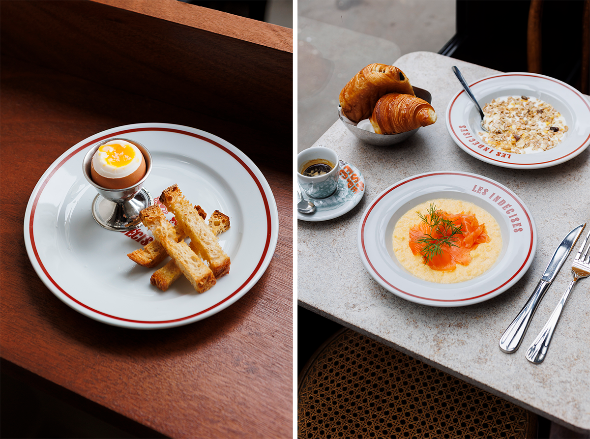 朝食体験も悪くない。アラカルトにはムイエットを添えたウフ・ア・ラ・コック(左/5ユーロ)、スモークサーモンかベーコンを添えたスクランブルエッグ(8ユーロ)、フロマージュブランとホームメイドグラノラ&ハニー(6ユーロ)など。photography: ©AliceCasenave