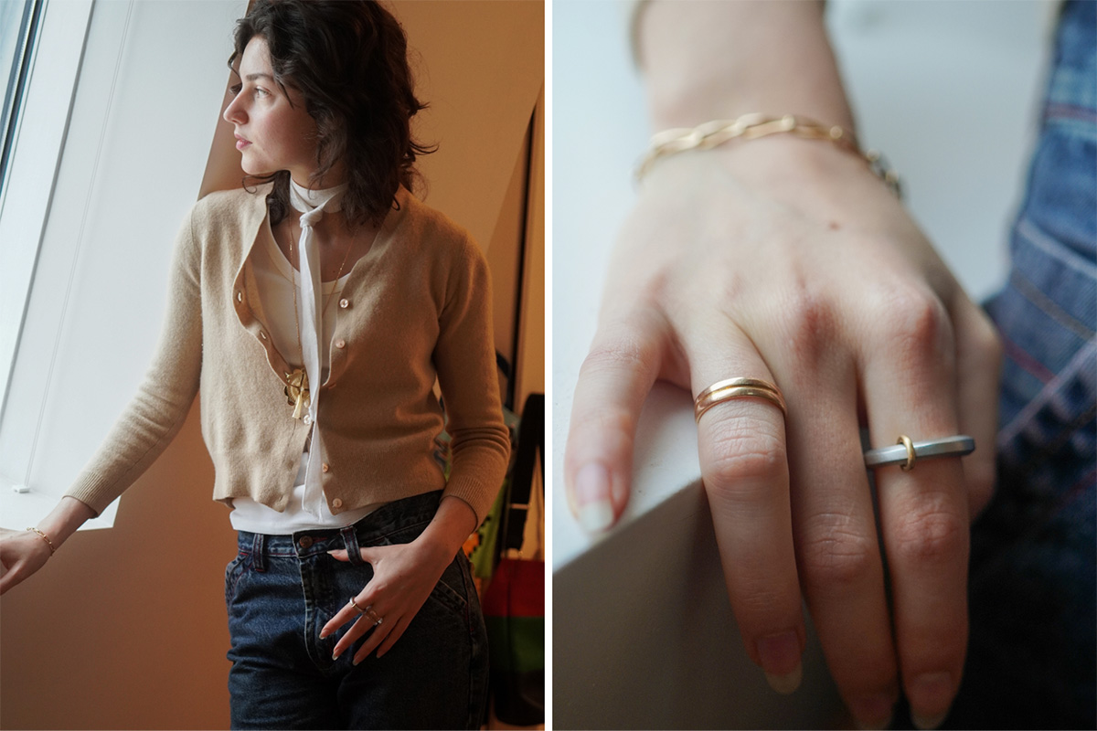 上品なカシミアと素朴な梱包紐のミックス&マッチ。通常は出合わないであろう組み合わせが、彼女の手にかかると不思議と調和する。指先にも現代とヴィンテージのジュエリー、新旧の時代を合わせて調和させる。ジュエリーデザイナーの私からすると、正直「なぜ紐を?」だったが、見れば見るほど、素材の「格」なんて関係ないことに気が付く。選ぶ人の意志が宿れば、何だって美しくなる。
