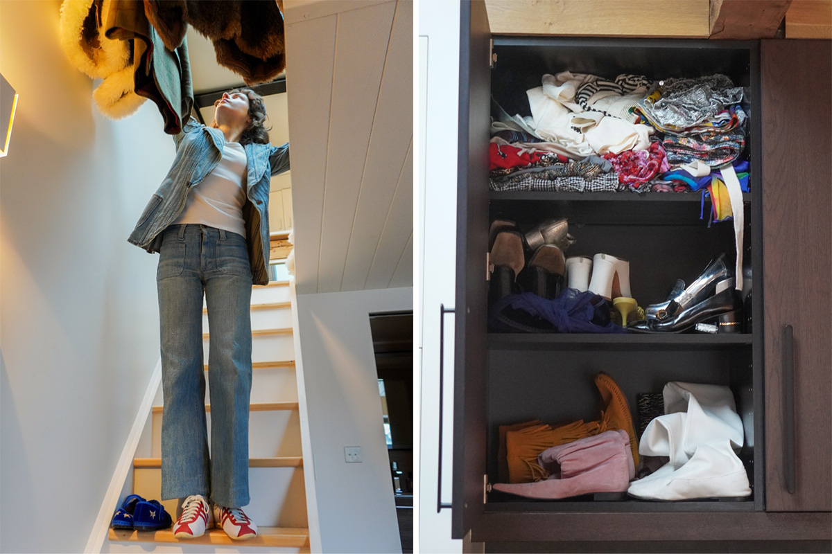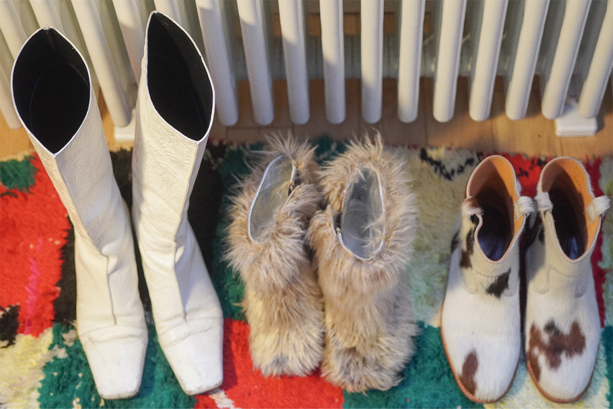 この大胆なスタイリング力は、どこで培うのかと気になって彼女の部屋を見渡すと、納得した。60年代のポスターの横に中世美術の画集、モロッコのラグの上にミッドセンチュリーの椅子、華やかな柄のカウボーイブーツが部屋の真ん中に鎮座。暮らしごと、あらゆる時代のミックスだった。