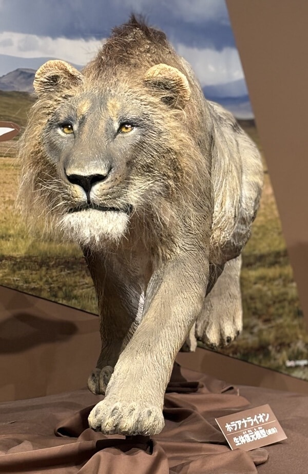 ケナガマンモス、ギガンテウスオオツノジカ、ホラアナライオンなどの全身骨格標本や生体復元模型が並んでいました。