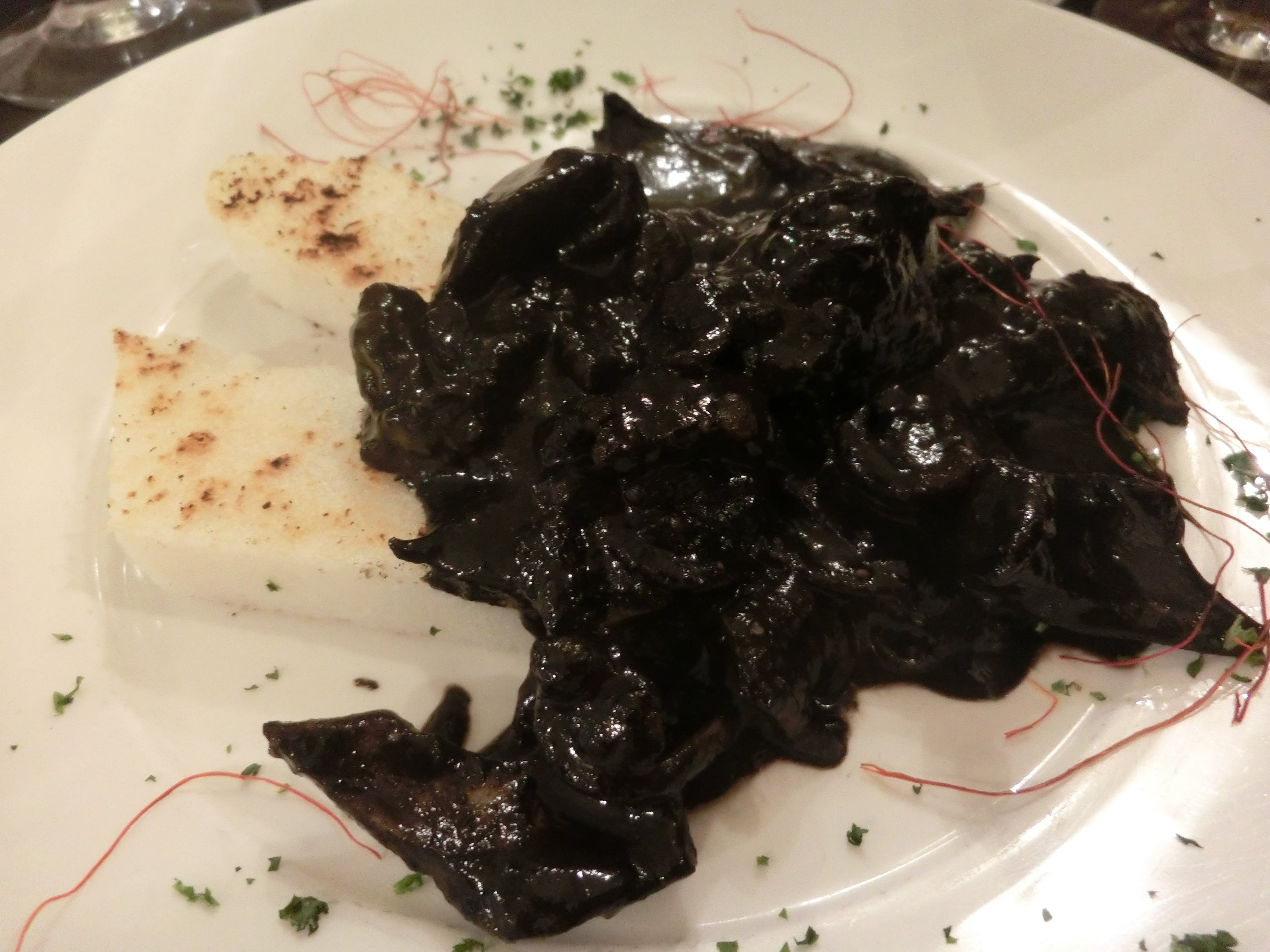 確かにすごい黒々したたっぷりのイカスミ。(添えられたのは白ポレンタ)