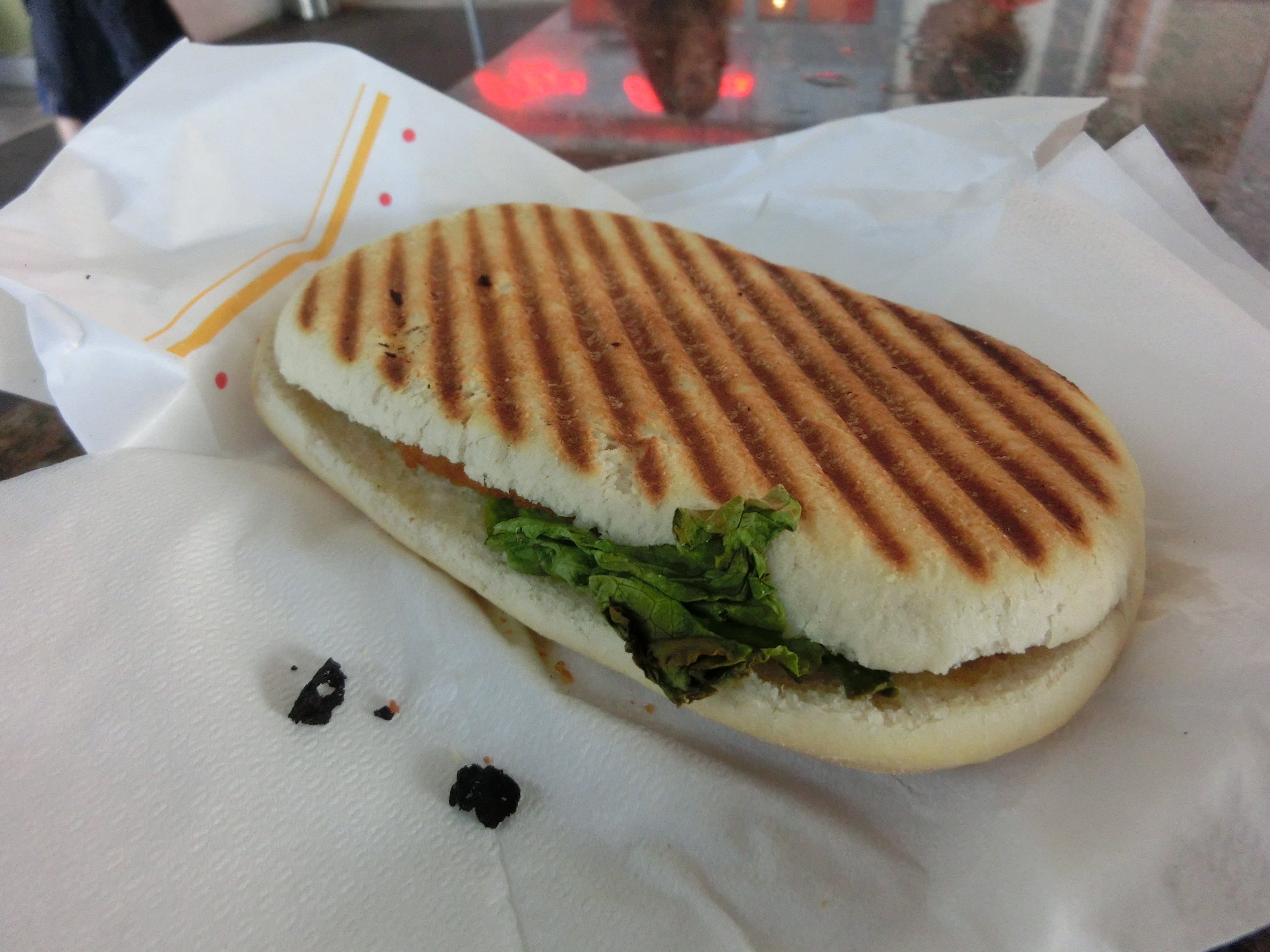 パリっとトーストされたパンに具はチキンカツレツにレタスとオリーブ↓