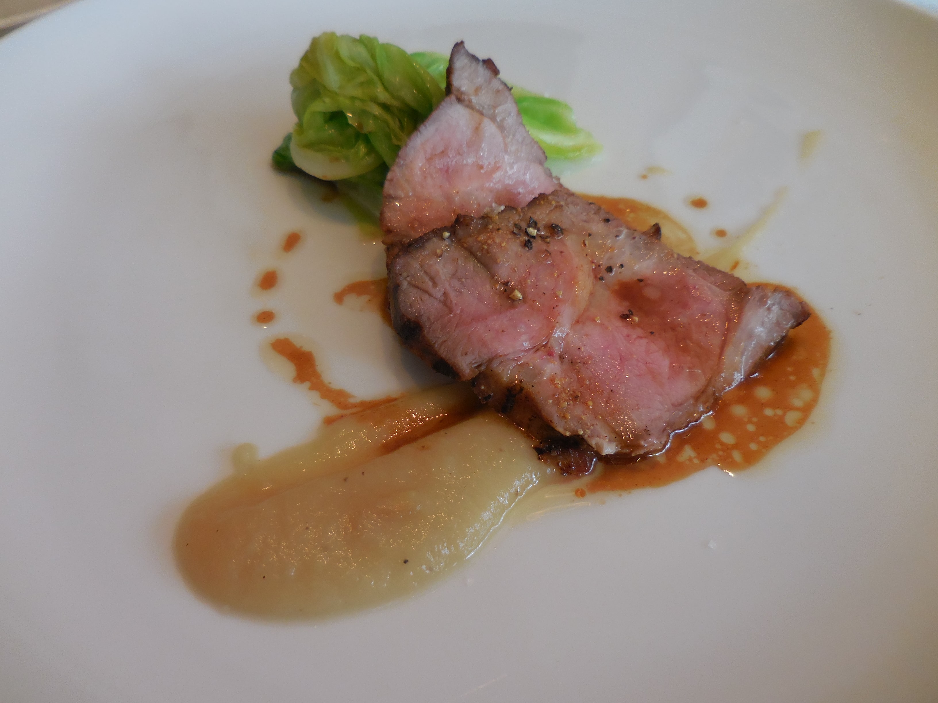 肉料理は苦味のあるふきのとうのクリームを添えた豚肉&春キャベツ。