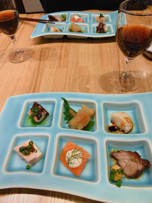 タコバジル、クラゲ、ホタテの四川ソース、天草大王(地鶏)、桜鱒、焼豚。