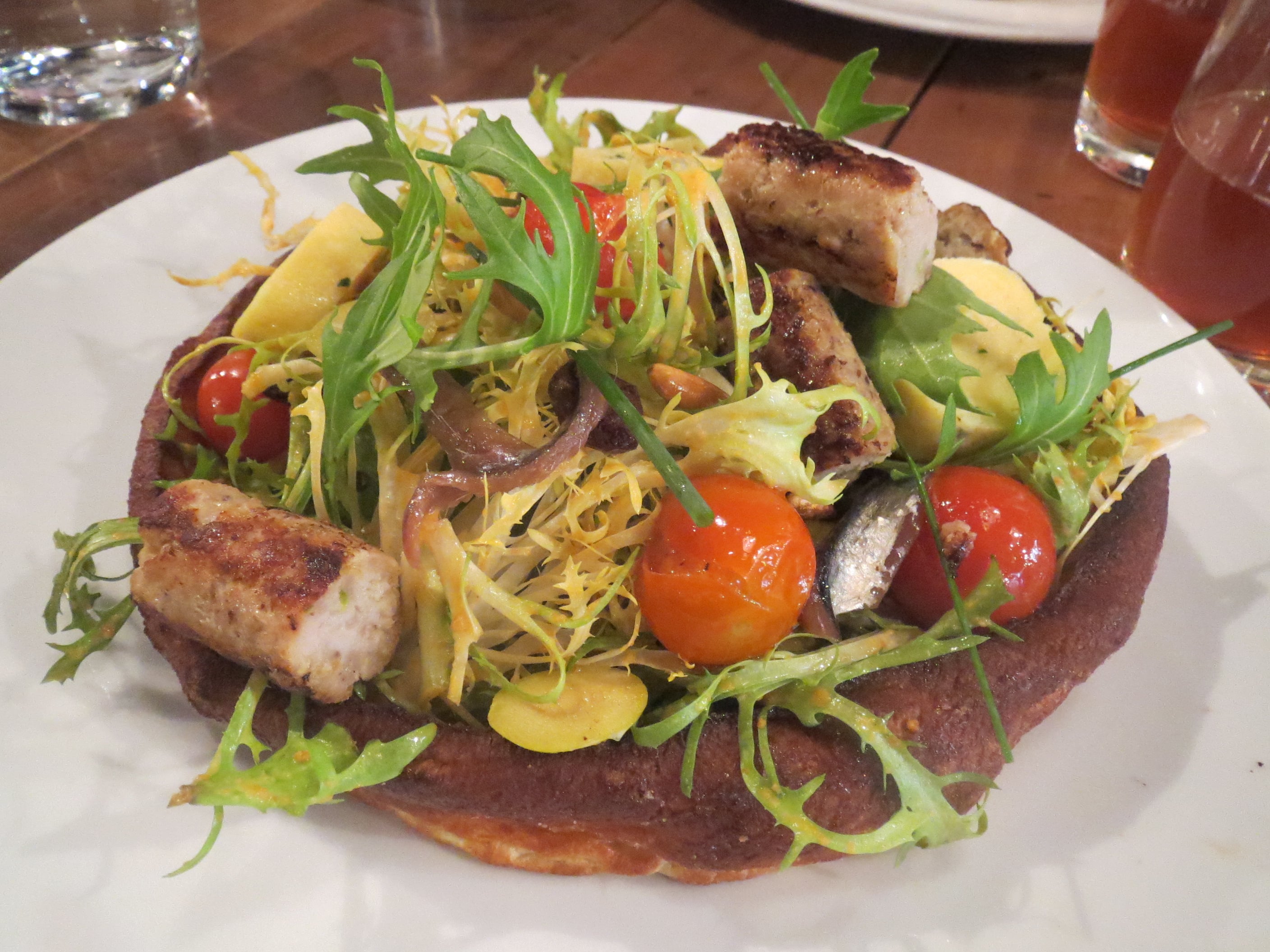 フレッシュで美味しいサラダがたっぷりで、その中にソフトな食感のソーセージや日本の