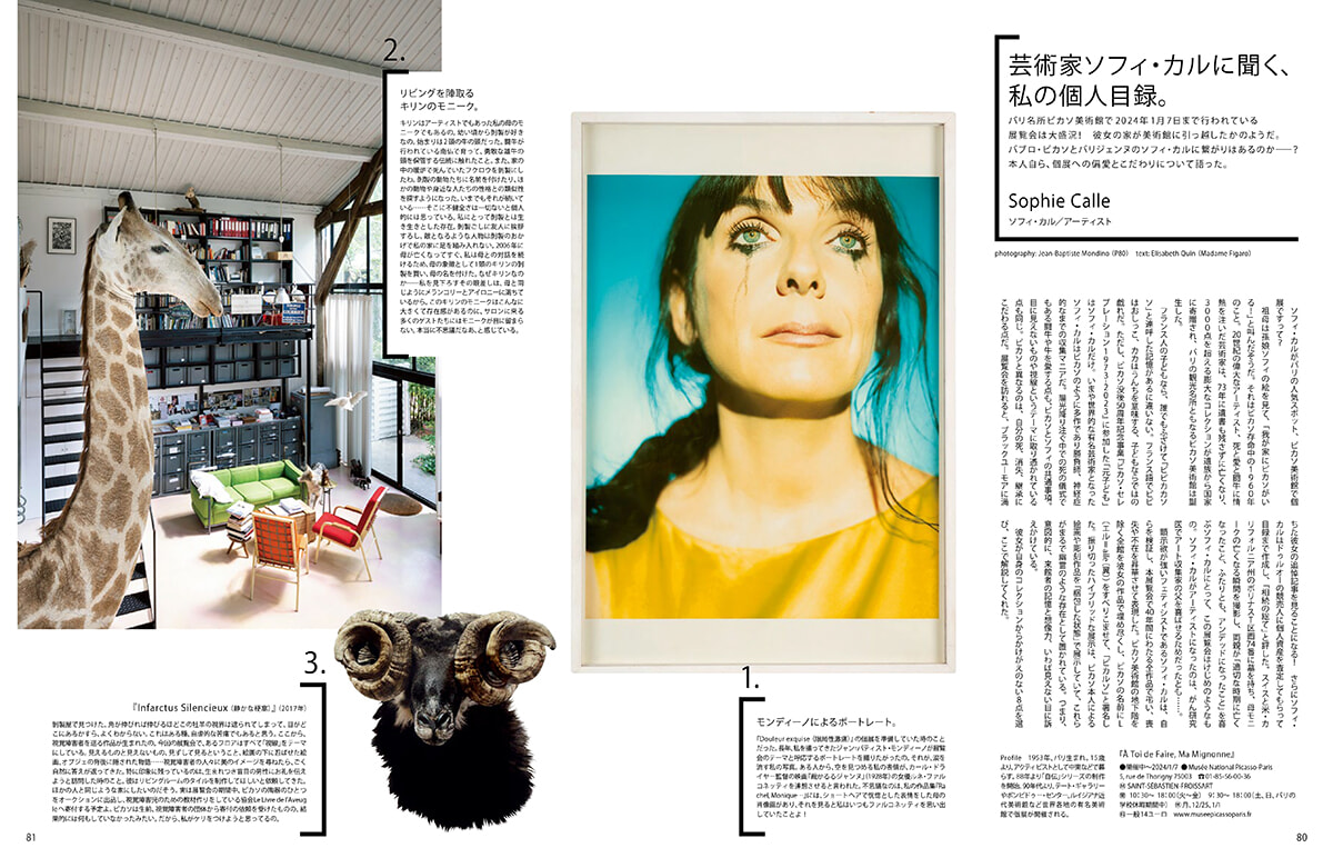 フィガロジャポンでは23年にパリのピカソ美術館で行われた個展『A toi de faire, ma mignonne』を写真とともに紹介。パブロ・ピカソ没後50年にあたる年に開催され、ピカソ美術館からソフィに声がかかったという展覧会だ。収集癖のあるソフィの子ども時代からのコレクションやアトリエ、ポートレートも掲載した。自らの人生そのものを観察の対象とし続けるアーティストの足跡を、これからも目撃したい。