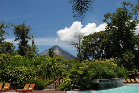 さて、ここで紹介する「タバコン・グランド・スパ・サーマル・リゾート」は、5ツ星の高級リゾート。周辺は熱帯雨林に囲まれ、すぐ近くにはアレナル火山が煙を吐いている、ダイナミックなロケーションにあるリゾートです。それだけではありません、世界でも希な豊かな温泉が湧き出る地域でもあり、「タバコン・ホットスプリングス」(タバコン温泉)は世界的にも知られています。効能は日本の火山性温泉とほぼ変わりませんが、何しろ、敷地内を流れる渓流の水そのものが温泉水なのですから驚きです。ものすごい勢いで流れ出る湯量の元となっているのが「アレナル火山」で、リゾートのすぐ近くにそびえています。1968年に、400年以上の眠りから覚めて大爆発を起こして以来、今も尚噴煙をあげ、時には火の手をあげることもある活火山。当然、この地域はコスタリカでも有名な国立公園となり、自然保護の対象になっています。