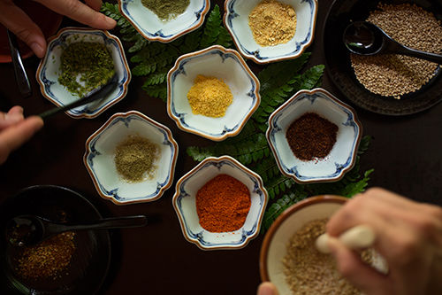 2日目の朝には、呼吸法やヨガの動きを取り入れたエクササイズのプライベートレッスンが。また朝食時には、辛さや香りなどを自分好みに調節できるオリジナル七味作りが楽しめる。スパイスは運に変化をもたらし、数種類が合わさることで火の気の勢いをパワーアップしてくれる。