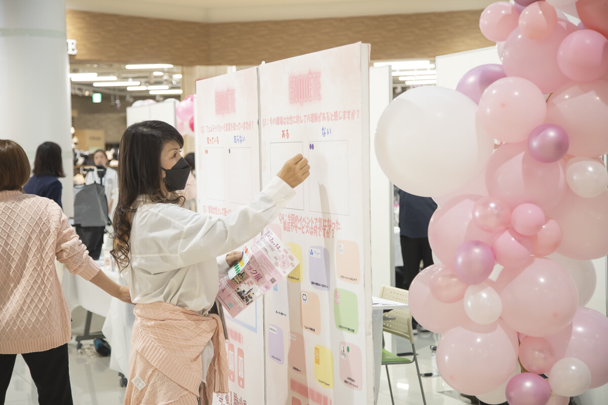 会場には、災害時に役立つフェムテック製品が体験できる展示・販売スペースのほか、女性の健康課題や働き方などについてのセミナーやワークショップスペースが設けられた。併設のイオンシネマでは、若年性乳がんをテーマにしたまつむらしんご監督による映画『あつい胸さわぎ』(2023年)も上映された。