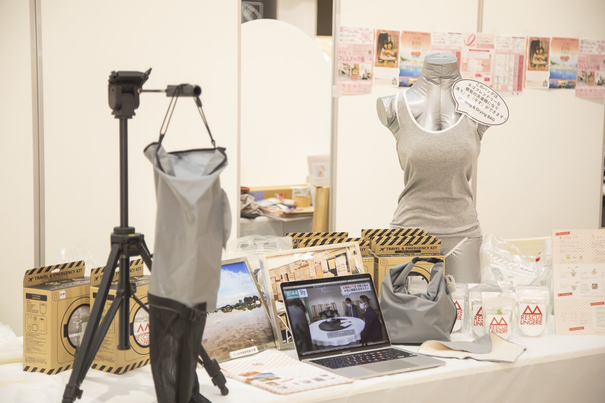ファンクションの本間麻衣さんが出展した「レスキューランジェリー」のブース。ランジェリーは、付属のバッグの中に少量の水と洗剤を入れればどこでも洗濯でき、メッシュネットがついたバッグの中で人目に晒すことなく下着を干すことができる。