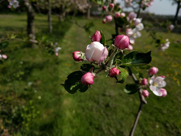2021年4月 野菜だけでなく、果樹も数十本植わっているEKO認定を受けた農園。こちらはりんごの花。 photo: Saki Morita