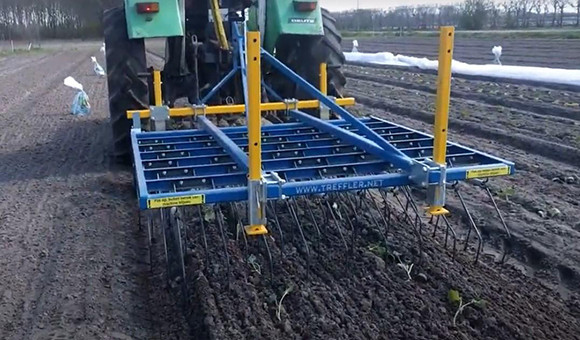 2021年4月 ブロッコリーの苗の間を機械で除草している様子。まだ雑草が発芽しないうちに、土の中から掘り起こしてしまい、乾燥・覆土で枯らす。物理的防除の一種。 photo: Saki Morita