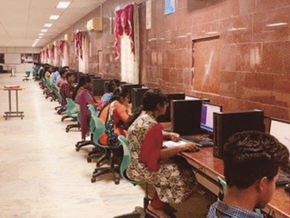 インドで、読解力や論理性など測るテストの実施風景。インドは、高等教育を受けた女性のうち、システム分野を学んだ人が8割にも上る。
