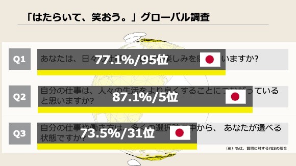 日本では、Q1.は116位中95位、Q2.は5位、Q3.は31位という結果になり、働くことを通して「人のためになっている」と感じている人が多い一方で、「働くことそのものに喜びや幸せを感じている」と答える人が他国と比べて少ない傾向にあることが明らかになった。