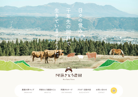 阿蘇さとう農園のウェブサイト。タカナードや牧羊、今後の展望などが写真やイラストとともにかわいらしく紹介されている。*阿蘇さとう農園ウェブサイトのスクリーンショット
