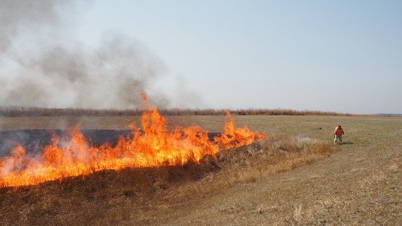 樹木を生やさず草原を維持するために、毎年地元住民が協力して行うという「野焼き」。このお陰で草原が保たれ、地下水涵養が行われるというが、気をつけていても事故が発生することも少なくないという。 photography : Aso Sato Farm