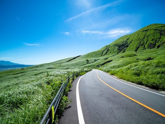 阿蘇の美しい草原を感じられる阿蘇パノラマライン。photography : Aso City