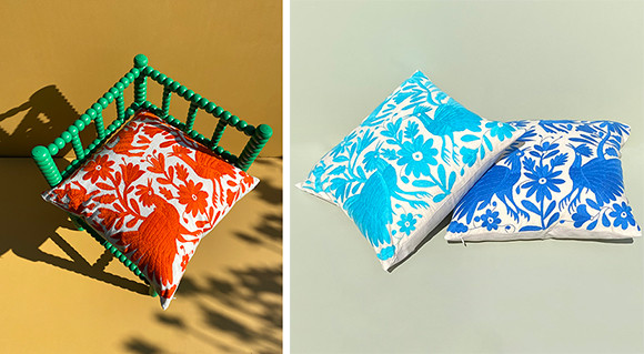 メキシコの日常と伝統のストーリーを刺繍したクッション。この刺繍は額に入れて出産祝いとしても好評だ。