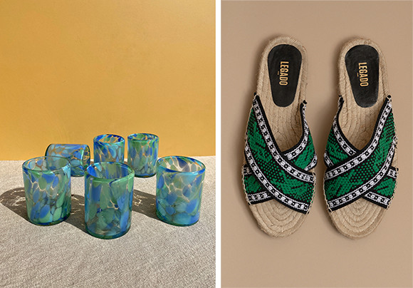 左: ハリスコ地方の吹きガラス。白い陶器などで洗練されたパリの食卓にもよく似合う。右: モチーフが魅力のメキシコのテキスタイルをエスパドリーユに。120ユーロ。