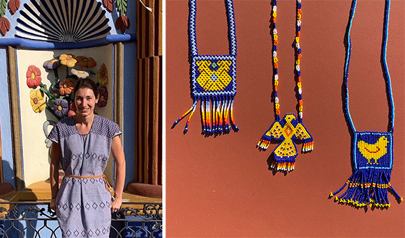 左:メキシコのテキスタイルで仕立てたワンピースを着たシャルロット。オアハカにて。右 :LEGADOではハンドメイドのビーズのジュエリーも扱っている。