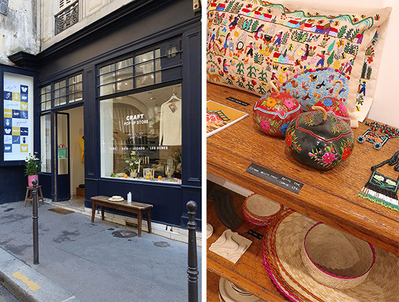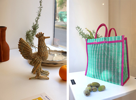 左:7月、マレ地区のスペースでプレタポルテ、陶器、オリーヴオイル作りの女性たちと一緒にポップアップを開催した。右: カボチャにペイントした容器はフリーダ・カーロの絵画の中にも登場する。