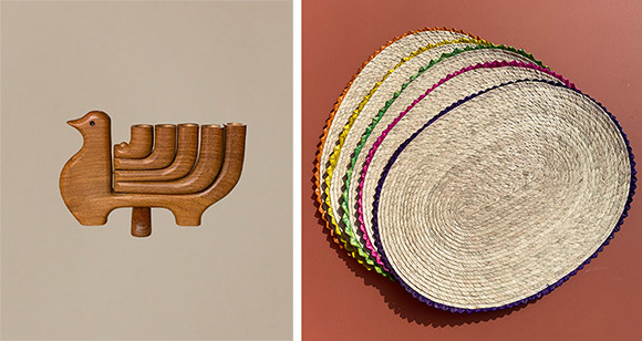 左: 鳩のキャンドルスタンド。5本のスタンドのうち4本は左右に動かすことができる。ヴェラクルーズ地方の木を使ったハンドメイドだ。140ユーロ。右: 手染めのスカラップフレームが囲む、 ヤシの葉を編んだプレース・マット。