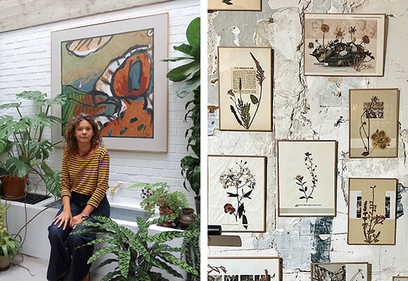 左:Stéphanie Montagut(ステファニー・モンタギュ)。4年前からパートナーと暮らす庭付きのパリ郊外の家で。アート作品、オブジェ、本、植物といったお気に入りに囲まれ、彼女にとって快適な仕事空間でもある。右:LM les fleursの名前で販売されるコラージュ。写真はブティックMaison des Vacancesでの展示から。インスタグラムは@lmlesfleurs photos:Mariko Omura