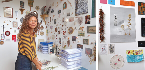 左:自宅2階のアトリエにて。右:アトリエの壁に好きなイメージを貼って。photos:Mariko Omura