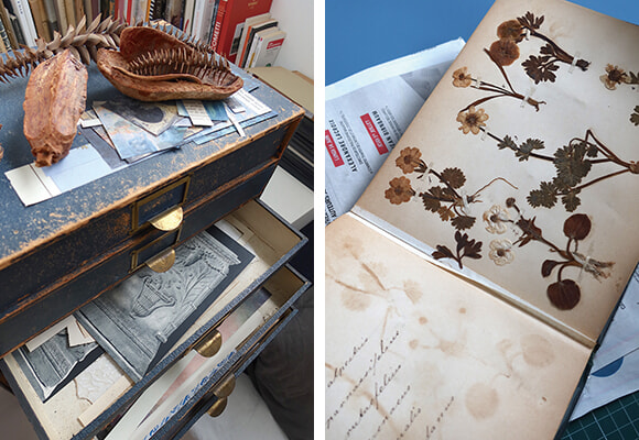 アトリエには掘り出した昔の押し花や古い紙などが大切に保管されている。photos:Mariko Omura