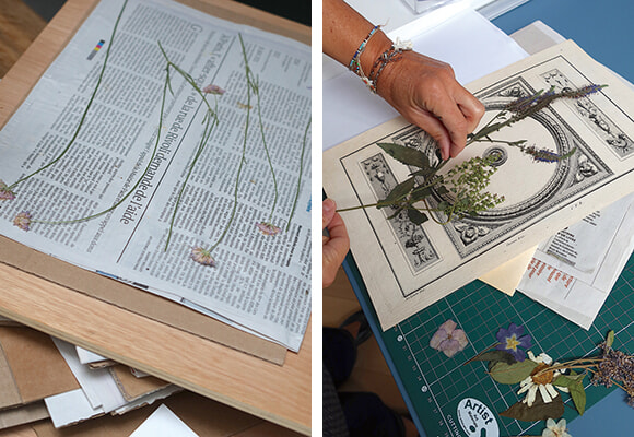 左:田舎生まれの彼女は花屋で売られているサイズも色も均一のパーフェクトな花は好まない。自然の創造である粗野で生命力の強さをたたえた野の花が好みである。右:建築エレメントの古いデッサンをベースに植物の配置を考える。すぐに糊つけはせず、一晩置いた後に配置し直すこともあるそうだ。photos:Mariko Omura
