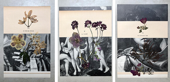 「ここでの展示には2つのタイプのコラージュがあります。古い紙に植物や言葉を配置するタイプ。もう1つは、庭の彫刻の絵葉書をベースに用いたシリーズです。これは仕事の過程がよりアーティスティックなものとなります。ボン・マルシェで求められたインテリア用装飾のための商品とは違います。メゾン・ドゥ・ヴァカンスって私は単なるブティックとは思っていません。ギャラリー的です。販売されている商品も古い掘り出し品が混ざっていたり、色合いも私の作品に似ていて、不完全なものに美を見出したり……同じ美意識、感性、ヴィジョンがあるんですね。オブジェがアートのように扱われる。例えばスツールが彫刻のようだったり、彫刻をスツールとして使う、といった。彼らは日常生活にアートを持ち込むセンスがあります」