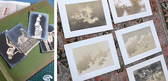 左:庭園の彫刻を撮影した古い写真を使ってシリーズを作る。右:雲がお線香の煙のように思え、日本へのオマージュとなるコラージュを彼女は製作する予定だ。photos:Mariko Omura