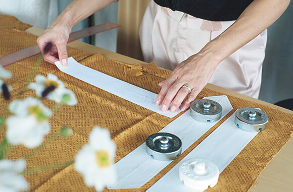 一枚ずつ手織りされ、本来は着物の生地でもある秩父太織は、繊細で伸縮性がないため、裁断や縫製の際には細心の注意を払って作業する必要があるという。