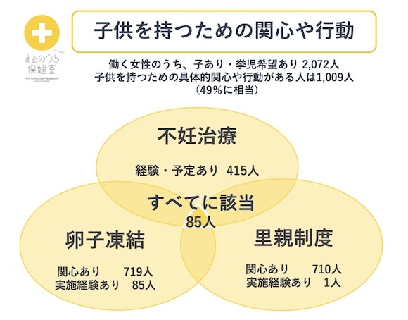 卵子凍結とならび、里親制度への関心も高く、働きながら子どもを持つためにいろいろな情報を収集し、真剣に考え、悩む女性の姿が浮き彫りになった。提供:まるのうち保健室