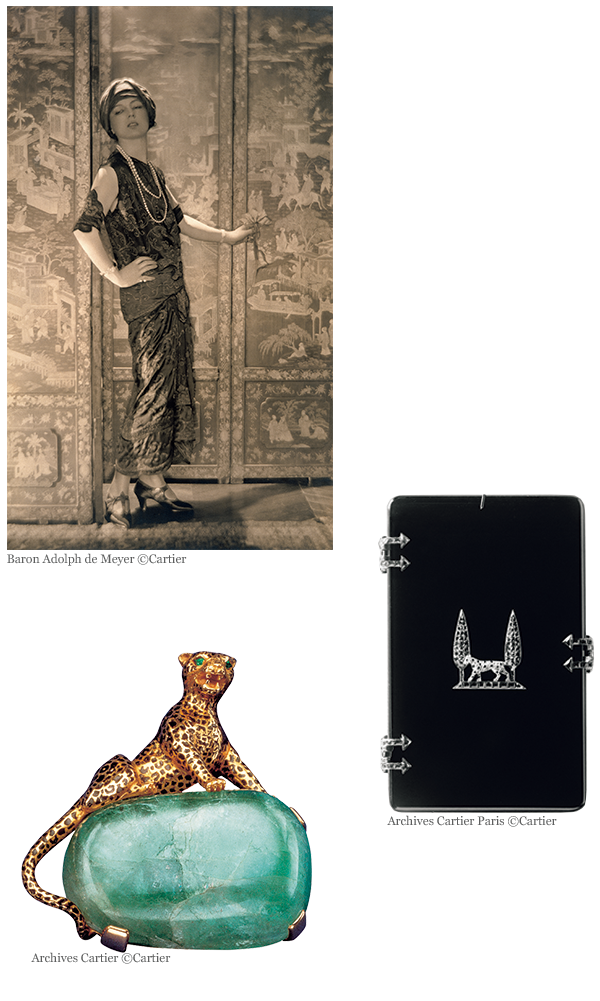 左上:好奇心旺盛で、自ら道を切り拓く姿から「パンテール」と呼ばれたジャンヌ・トゥーサン。彼女はインド、ペルシャ、中国をインスピレーション源に、”トゥーサン テイスト”と呼ばれる大胆な個性をカルティエで発揮した。 上:1917年、すでにジャンヌの才能を見抜いていたルイ・カルティエが彼女に贈ったシガレットケース。 左:「パンテール」をカルティエの象徴に決定づけた1948年発表のブローチ。