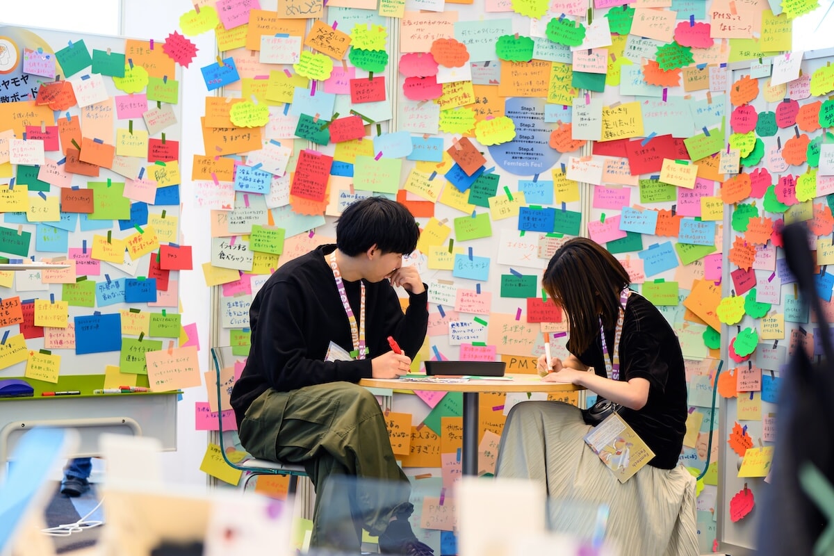 コロナ禍中に開かれた前回のイベントで、来場者からの「イベントで感じたことをすぐにアウトプットできる機会がほしい」という声をもとに設置されたワークショップスペースでは、「特定の職業で ニーズがありそうなフェムテックを考えてみよう」「次世代へ繋げたい願いを書いてみよう」など9つのテーマに沿って、来場者が思い思いに自分の気持ちや考えを表現していた。