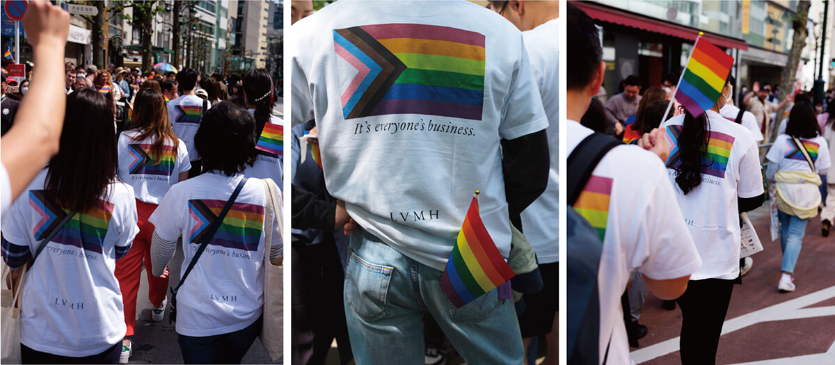 2019年には、国連による職場におけるLGBTIに関するビジネス行動基準に署名。以来、各ブランドとともにそれぞれのセクターや地域で、プライドパレードへの参加をはじめとしたLGBTI+に焦点を当てた活動を展開する。日本では2020年に日本初のプライド月間記念イベントを開催し、ALL LVMH プライド ジャパン コミュニティを設立。社員の主導により、2022年からコミュニティのメンバーが東京レインボープライドのパレードに参加している。数年にわたるこうした自発的な活動が徐々に広がり、今年、グループ全体としての協賛へと発展した。