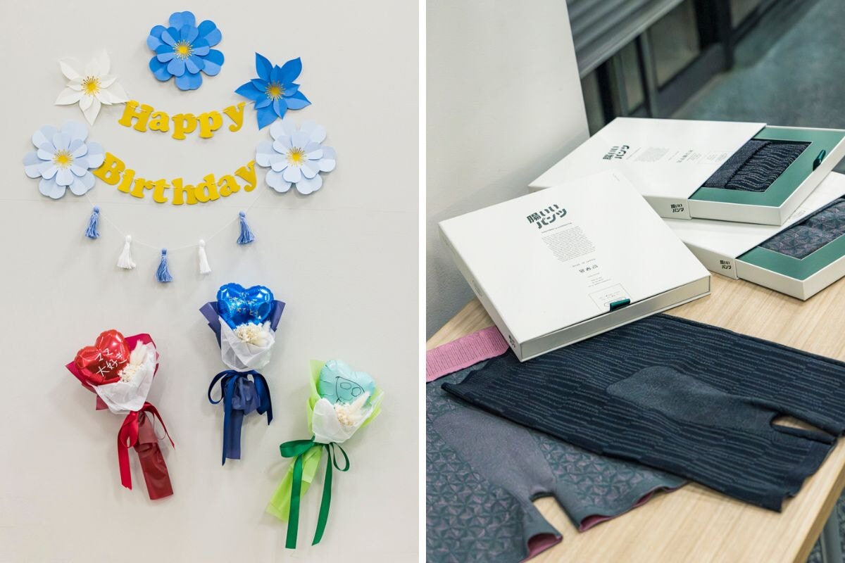 左:堀口さんが、在日外国人女性たちと展開するソルルナの飾り付けアイテム。子どもの誕生日だけでなく、最近は母の日や記念日のプレゼント、推し活のアイテムとしての需要も高まっているという。右:木村さんが展開する「腸いいパンツ」は働く男性も手に取りやすい、スタイリッシュなデザインが特徴。