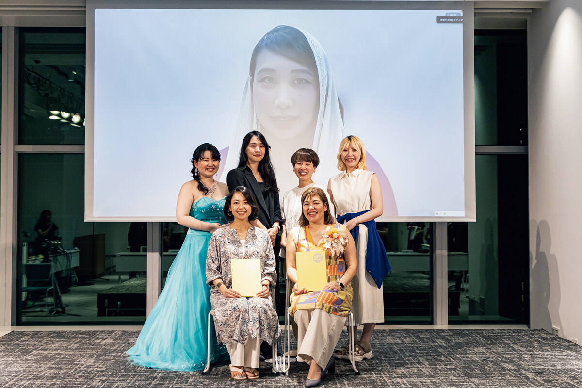 BWAピッチコンテスト2024のファイナリストたち。左奥後列左から、ムジカ・ルーモアの田ノ原豊織、ネム・志村千奈都、ウィズ・平井晴子、祭・清水舞子。前列左から、おりおり・堀真菜実、リンネ・小島幸代。ダラジャパンの角田弥央(スクリーン)はタンザニアからオンラインで参加した。photography: Mirei Sakaki