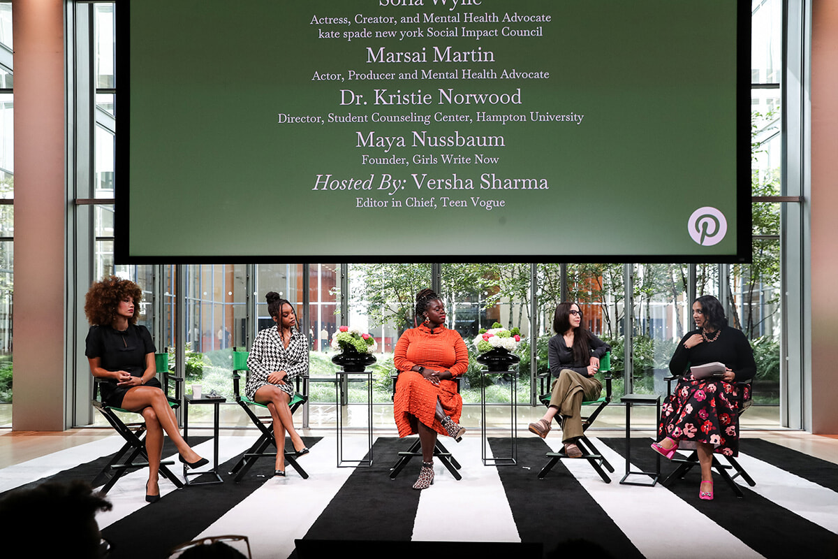 「第3回 女性のメンタルヘルスに関するグローバルサミット」より。「女の子と若者のメンタルヘルス、孤独との闘い、コミュニティーの創造について」というテーマのパネルディスカッションでは『ティーン・ヴォーグ』編集長ヴェルシャ・シャルマが進行役となり、俳優/プロデューサー/メンタルヘルス提唱者のマルサイ・マーティン、女優/クリエイターのソフィア・ワイリー、ハンプトン大学臨床心理学者のクリスティー・ノーウッド博士、「Girls Write Now」創設者のマヤ・ヌスバウムが登壇。