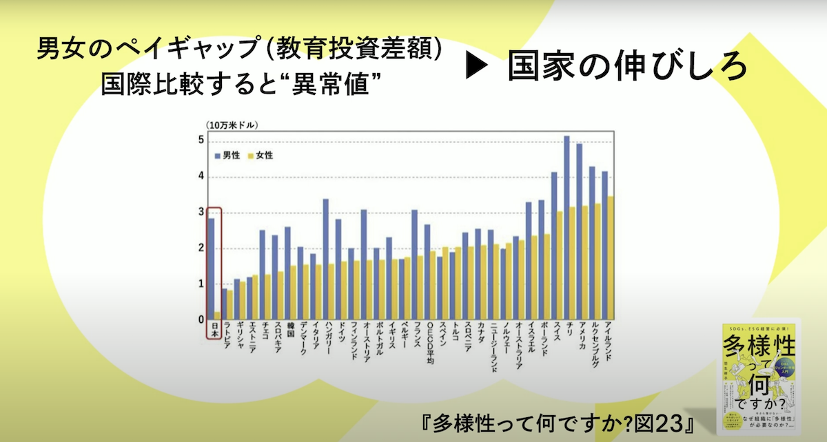ジェンダーギャップのひとつとして、羽生氏が注目をするのが男女のペイギャップ(教育投資差額)だ。成人するまでにかかる教育コストを引いた生涯年収の男女差のことを指すが、日本は他国と比べて、このギャップが著しく大きい。