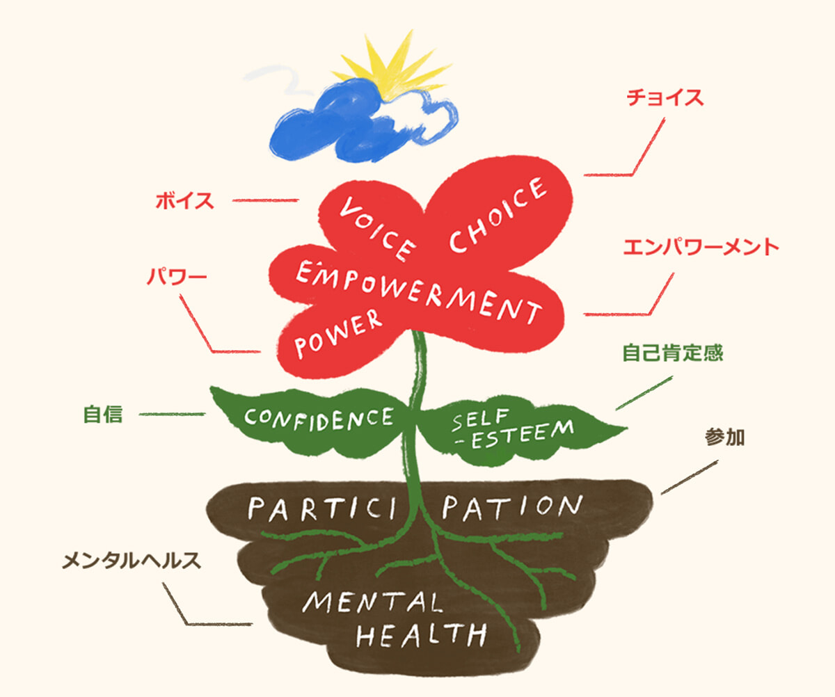 私たちは女性のエンパワーメントとメンタルヘルスを花びらと根の関係にたとえています。美しい花を咲かせるためにはしっかりした土壌が欠かせません。女性が自分らしい意見、選択、そして人生を舵取りできる力を発揮するためにも健全なメンタルヘルスを養うことが必要なのです。
