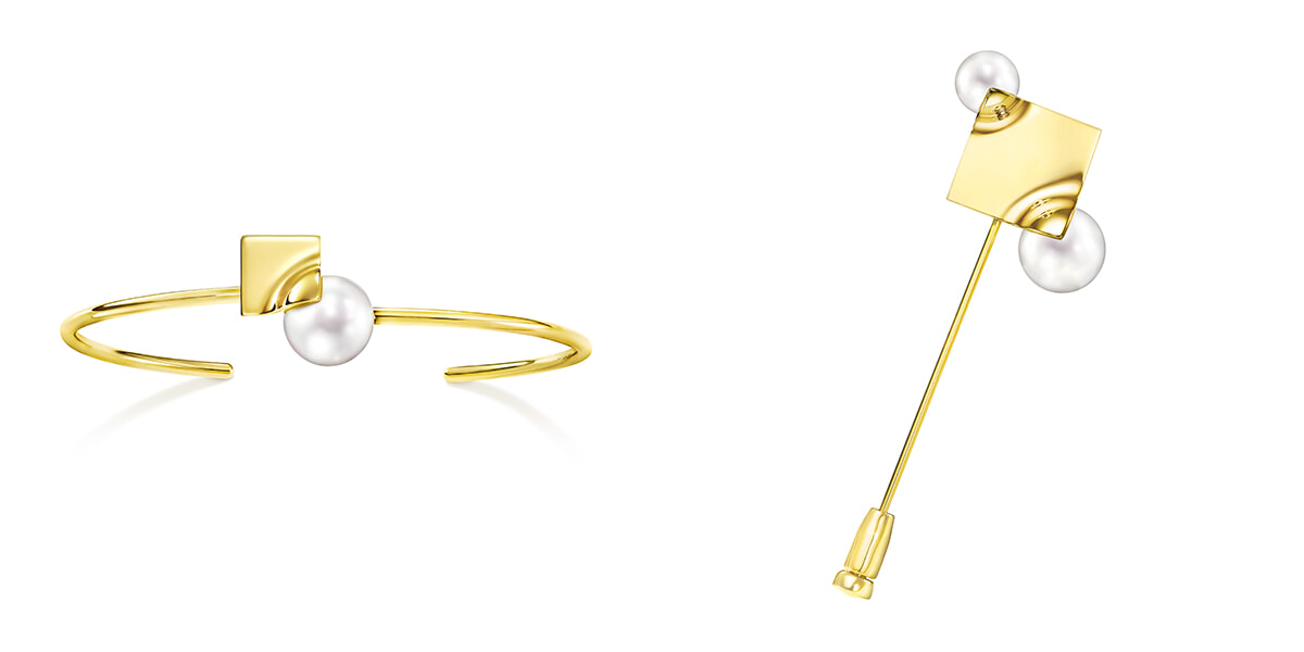 スクエア型のゴールドとパールを合わせたモダンなデザイン。左から「スクエアリーフ」ブレスレット(YG×淡水真珠)¥770,000、同 ブローチ(YG×淡水真珠)¥308,000/以上タサキ