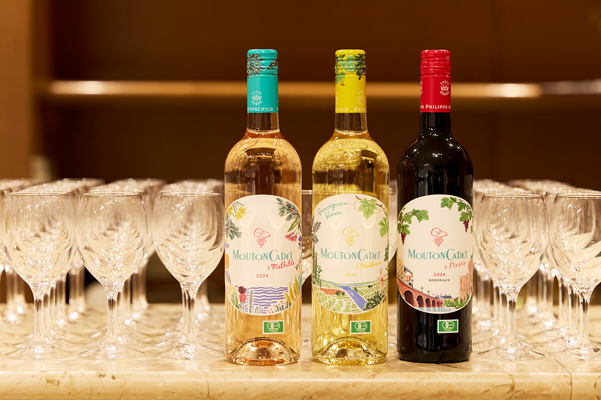 エノテカ「ムートン・カデ・フレッシュ・オーガニック」コレクション。「あらゆる人に、よりカジュアルにワインを楽しんでもらいたい」と始まったシリーズは、現在、将来のワイナリーを担う次世代のロスチャイルド家の若手メンバーたちによって引き継がれている。