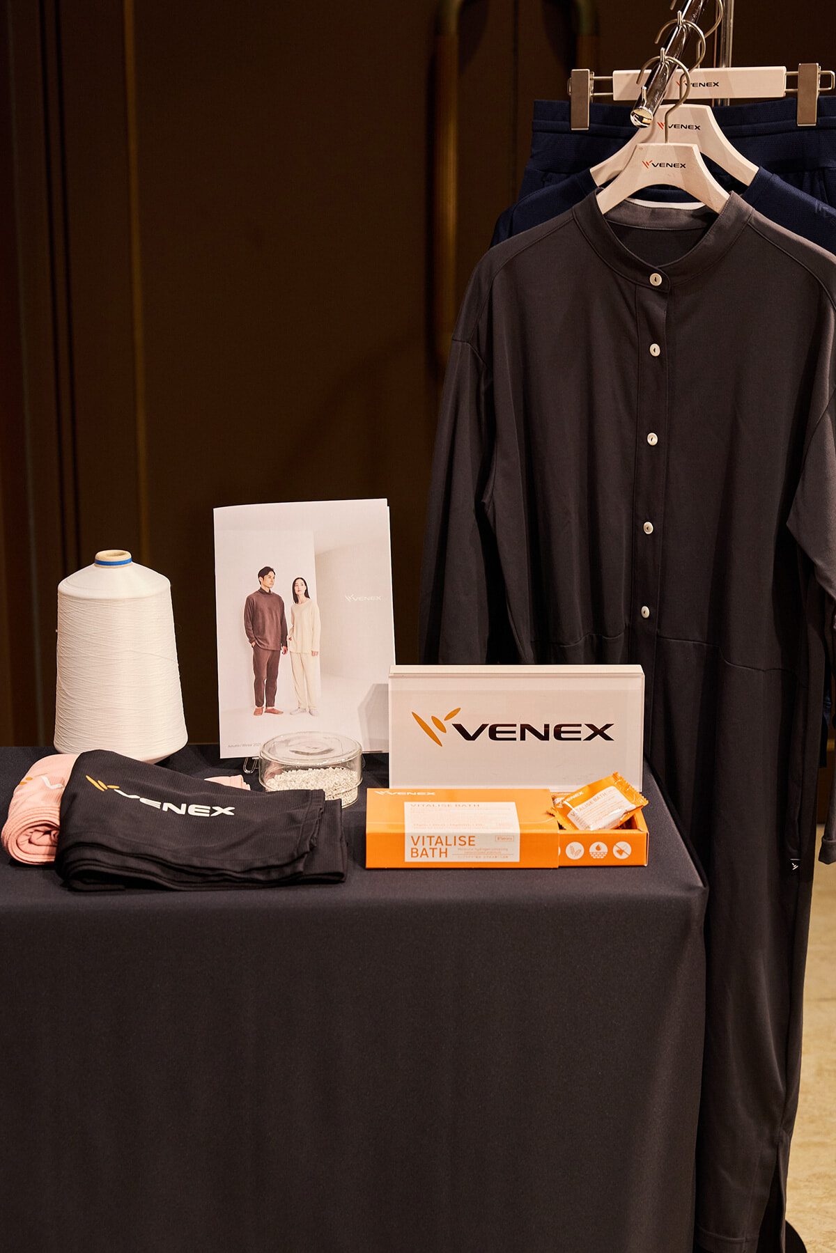 ベネクスは入浴剤「バイタライズバス」のほか、同社の主力製品でもあるリカバリーウエアを会場に展示。