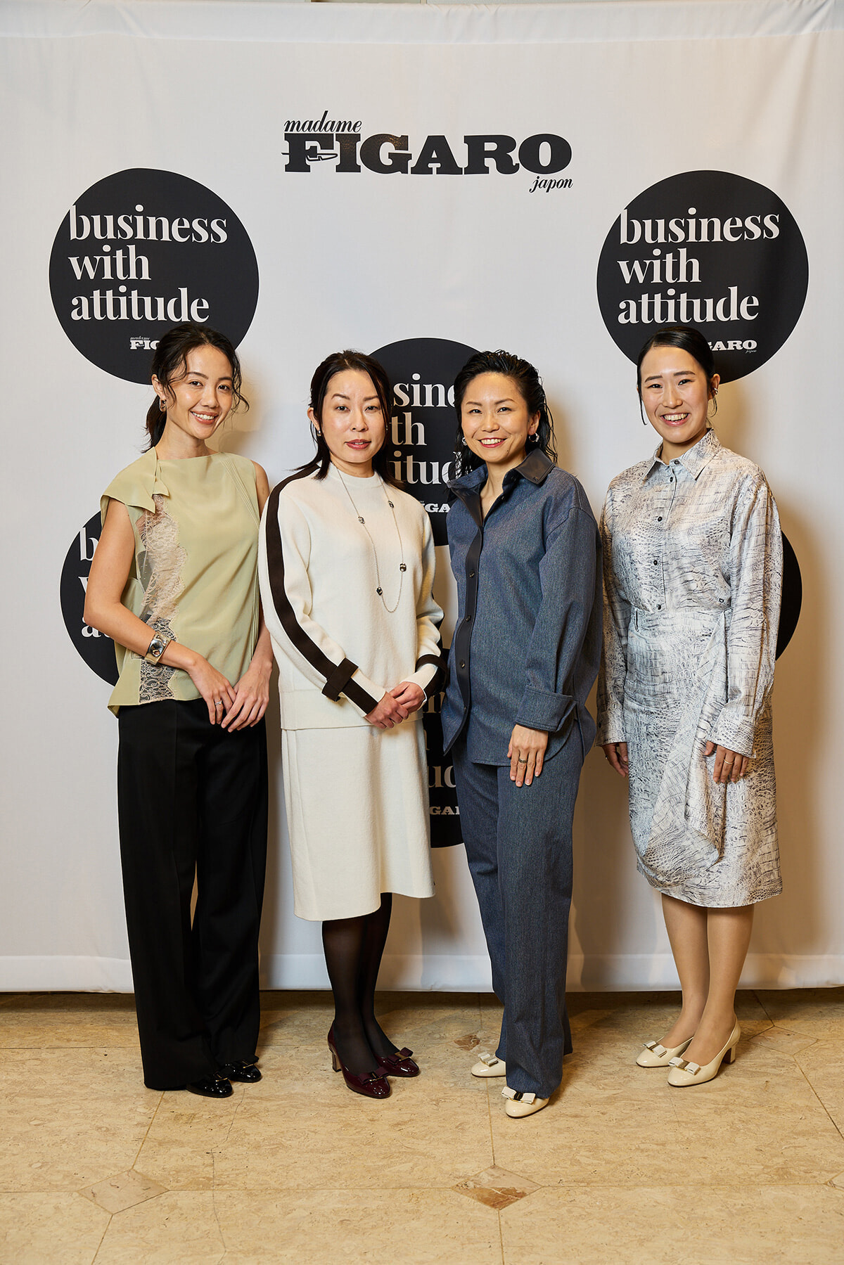 BWAアワード2025受賞者の(左より)佐藤マクニッシュ怜子、藤原加奈、藤岡聡子、金天憓の衣装はそれぞれフェラガモが提供。創業者の娘であるフィアンマ・フェラガモが仕事に家庭に忙しい女性たちのためにデザインしたメゾンのアイコニックシューズ「ヴァラ」を着用した。styling: Natsumi Sato