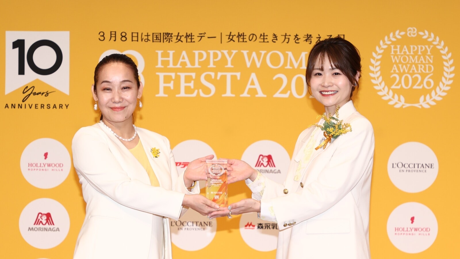 今年で10周年を迎えたHAPPY WOMEN FESTAを記念して開催されたHAPPY WOMEN AWARD 2026では、ウィメンズアイ代表の石本めぐみ(左)がソーシャルインパクト賞を受賞した。