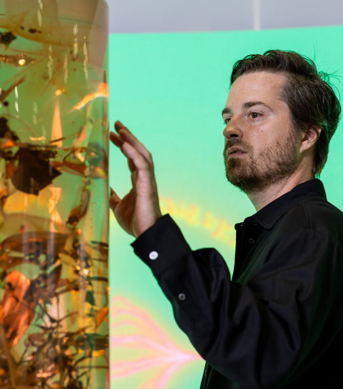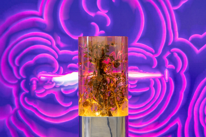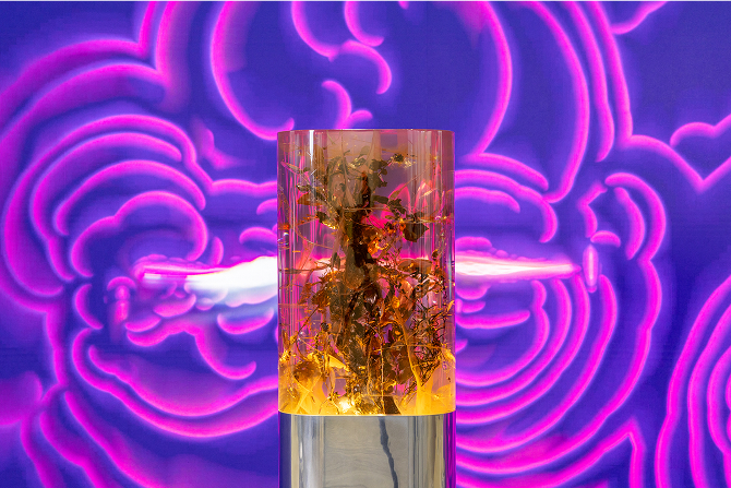 琥珀のような樹脂にブドウの古木、ウマノスズクサ、シロツメクサを閉じ込め、ペリエ ジュエというメゾンの持つ環境を保存した。背後に広がるスクリーンは「植物の鼓動の音」とともにさまざまに色を変えていく。